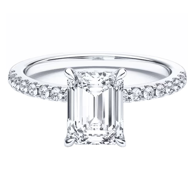 This 14 karat white gold hidden halo diamond engagement ring features one 3/4Ct Emerald cut center Newborn Created Diamond and is accented with 1/4 carat total weight of created round diamonds.