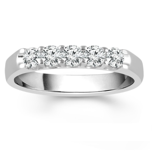 This 14 karat white gold diamond wedding band features 1/4 carat total weight of round brilliant diamonds.
