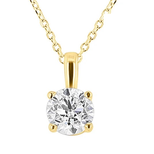 14 karat yellow gold diamond solitaire pendant with one 1CT round Newborn Created Diamond.