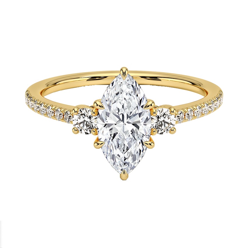 This 14 karat yellow gold diamond engagement ring features one 1 Ct marquise center Newborn Created Diamond and is accented with 1/2 carat total weight of created round diamonds.
