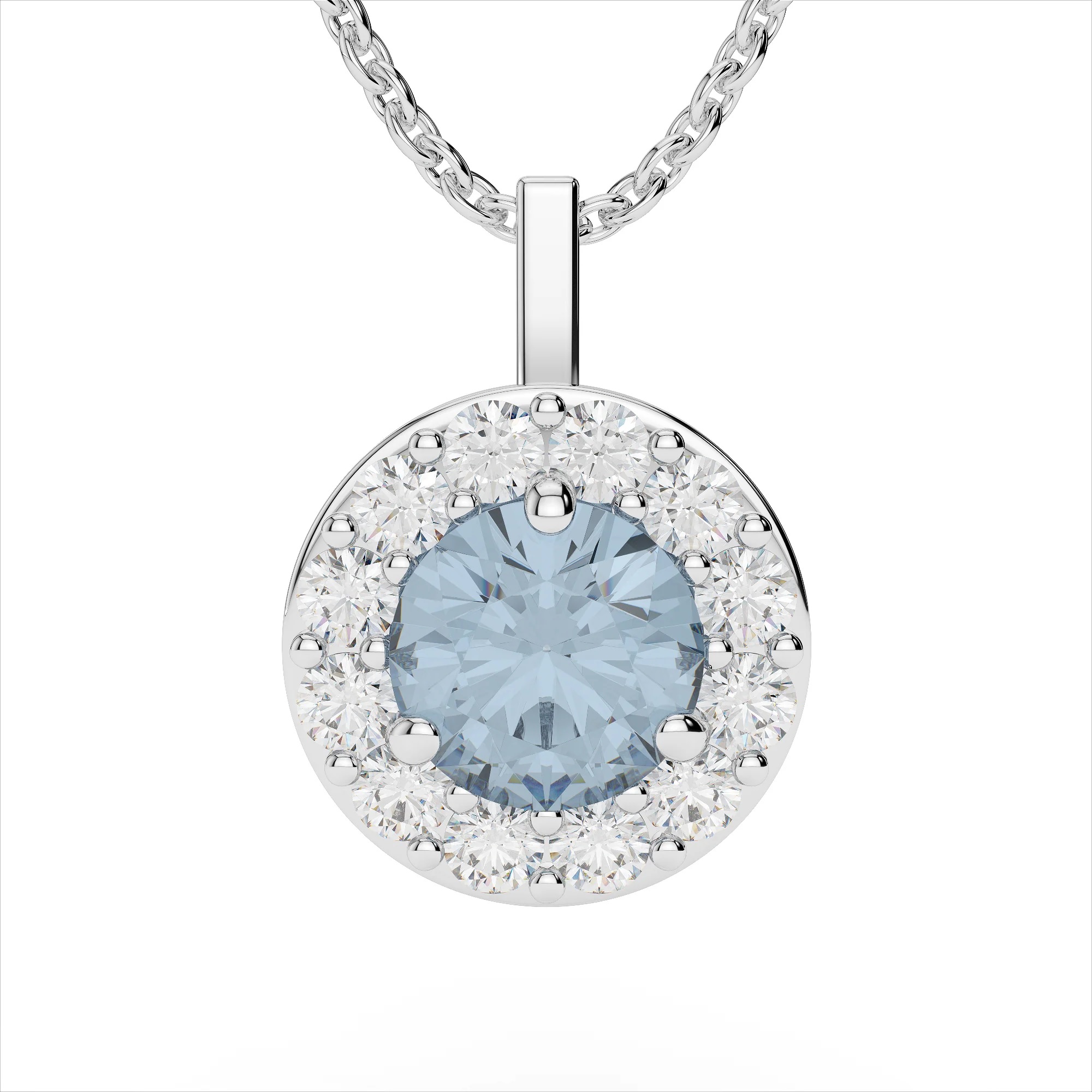 14 karat white gold aquamarine pendant with round brilliant diamonds.