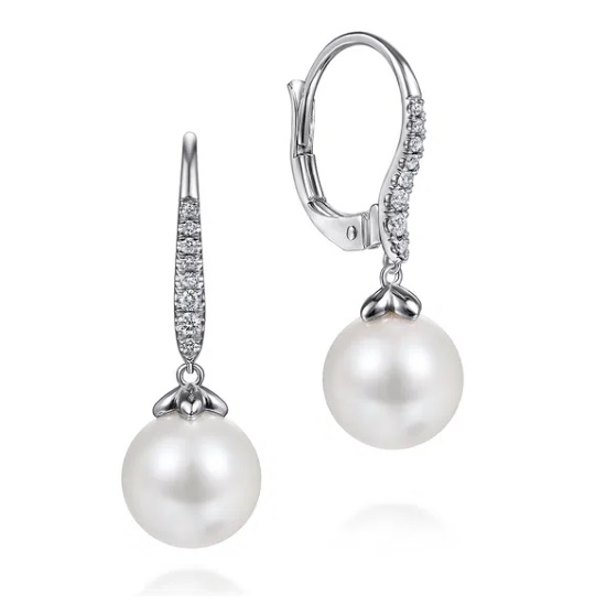 14 karat white gold pearl and diamond leverback earrings by Gabriel & Co. with .14 carat total weight of round diamonds.