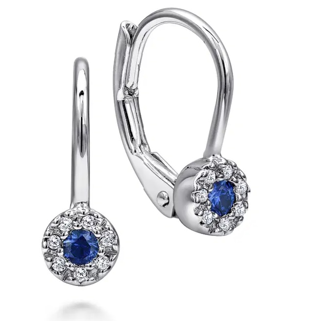 14 karat white gold sapphire earrings by Gabriel & Co. features .05 carat total weight of round diamonds.